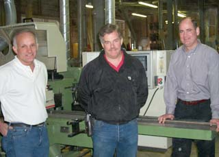 Photo by Benjamin Minnick Tom Harkins, left, stands by his brother Jim, center, and marketing manager Phil Agnelli in Washington Hardwood's production building in Seattle. |