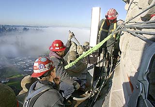 Workers use safety lines while making repairs high atop the State Capitol in Olympia.
