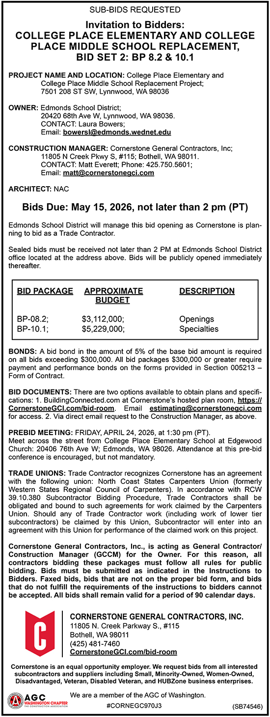 | COLLEGE PLACE ELEMENTARY AND COLLEGE PLACE MIDDLE SCHOOL REPLACEMENT, BID SET 2: BP 8.2 & 10.1 Cornerstone General Contractors |