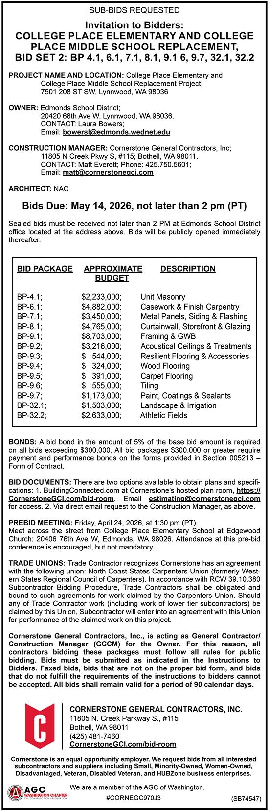 | COLLEGE PLACE ELEMENTARY AND COLLEGE PLACE MIDDLE SCHOOL REPLACEMENT, BID SET 2: BP 4.1, 6.1, 7.1, 8.1, 9.1 6, 9.7, 32.1, 32.2 Cornerstone General Contractors |