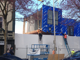 The first modular units arrived Monday for Taproot Theatre Co.'s $3.5 million expansion in the Greenwood arts district of Seattle. About 13 modules were scheduled to come yesterday and another eight will arrive today and Wednesday.