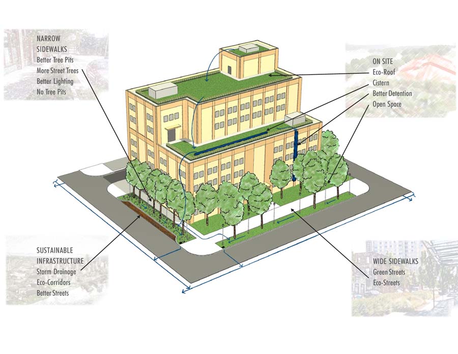 The answer lies in taking a broader view of an urban project's site. Tremendous opportunities for sustainable site design emerge by considering the building as a means to provide site-like environmental benefits, and reconsidering an urban infill site as both the private parcel AND the adjacent public right of way. Considering the site and street frontage continuum as the total project site increases the area available for sustainable site design by up to 70 percent.