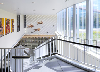The contemporary design of the Douglass-Truth addition preserves the historic form and materials of the landmark structure. The glass connector between the new volume and the historic building sits below the main roof of the historic building. The historic red tile roof, with its broad overhanging eave and ornamental terra-cotta frieze, remains visible as it traces around the perimeter of the original structure. The point of connection between new and old is reduced to the smallest possible extent. One thousand of the 1,050 pieces of terra-cotta on the building were preserved. The addition is clearly differentiated from the historic structure. Its glass and copper cladding lighten its mass in contrast to the solid, dense character of the masonry and tile roof on the historic building. This variation in material, detailing and color on the addition creates a distinction between the historic building and the new structure that maintains the classical proportions of the historic building. The copper clad volume over the new reading room and community meeting room serves as a light monitor. It slopes down and away from the historic building, deferring to the historic library’s primary place in the composition. The extensive glazing on the south and east elevations of the addition make it a mirror for the original building.