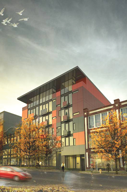 Amenities include a shared rooftop terrace and two levels of underground parking. One or two street-level commercial spaces are also planned.