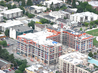 When I told my mother and grandmother in 2003 that I was selected to do the structural engineering on a new apartment building in Ballard, they were not too thrilled. The new building was slated to replace the small aging neighborhood QFC. As local residents, they had been doing their shopping there for many years. However, they quickly came around when I reassured them that a bigger and more modern QFC would replace the original store. At that point no one knew the struggles and joys that would lie in front of us over the course of the next six years. Ballard on the Park is a 10-story mixed-use building that borders 24th Avenue Northwest to the west and overlooks the Ballard Commons Park to the east. The new 42,000-square-foot QFC, slated at street level, is sandwiched by seven stories of apartments above and two levels of below-grade parking. The building includes 268 apartments ranging in size from 570-square-foot studios to 1,200-square-foot townhouses. QFC began tenant improvements in June and is planning to have the store open for Thanksgiving shopping. The apartments will be available in the late fall.
