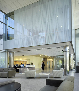 The designers emphasized daylight, visual connections and improved wayfinding. The two-story glass pavilion is adjacent to courtyards. A glazed circulation core rises from the lobby and reveals activities inside.