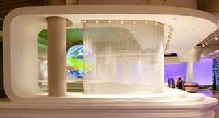 The interior of the 10,000-sqaure-foot visitors’ center is also used for parties, press conferences and other large events. The center’s first display is a large orb that uses 3D technology to project real-time statistics and information.