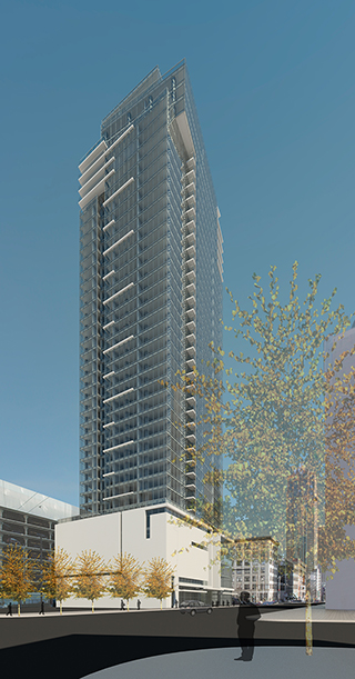The tower will have at least two levels of underground parking, a residential lobby and lounge, and two amenity spaces: one on top of the podium at the sixth level and the other above the 39th floor.