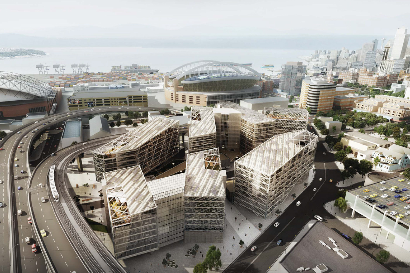 Plans call for seven office buildings with 150,000 combined square feet of retail space near CenturyLink and Safeco fields.