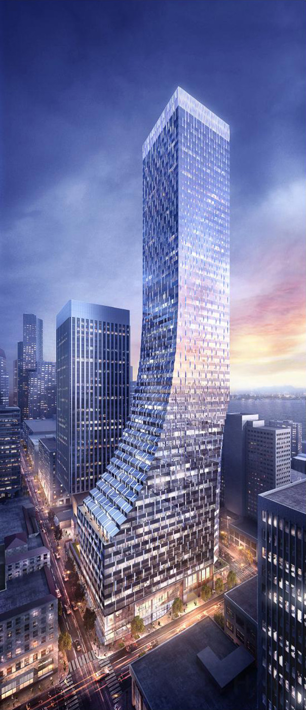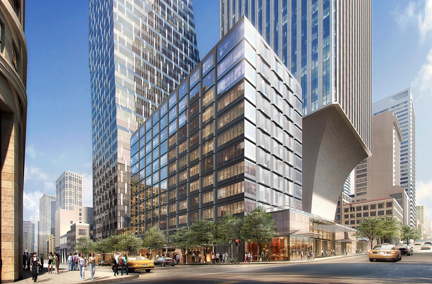 The latest plan calls for a 59-story building with 780,000 square feet of office space topped by 181 apartments. A new 12-story building on the site would have 155 hotel rooms.