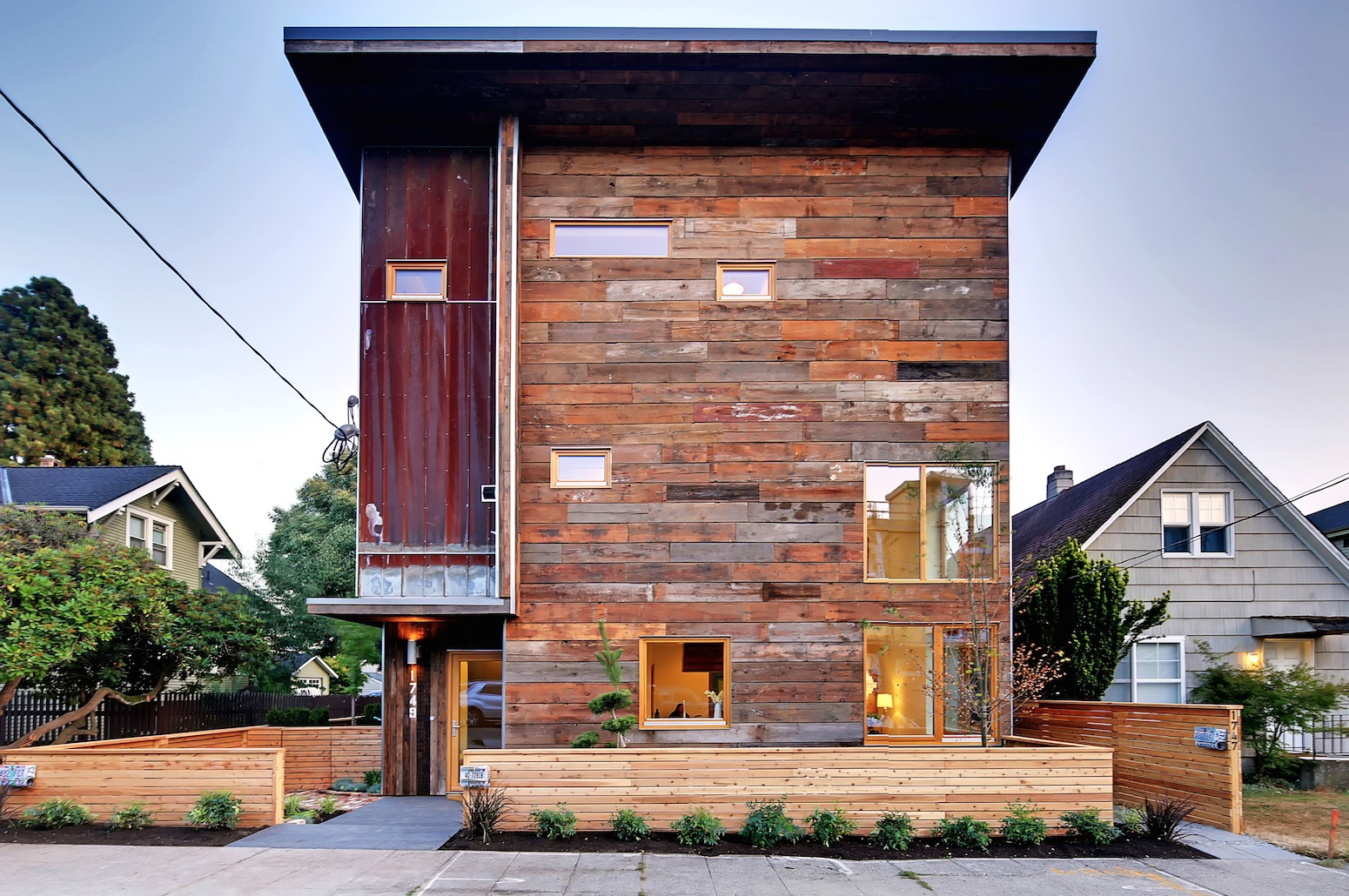 The siding is cedar and weathered steel salvaged from an old cannery in Oregon's Willamette Valley. All the framing was done with FSC-certified wood.
