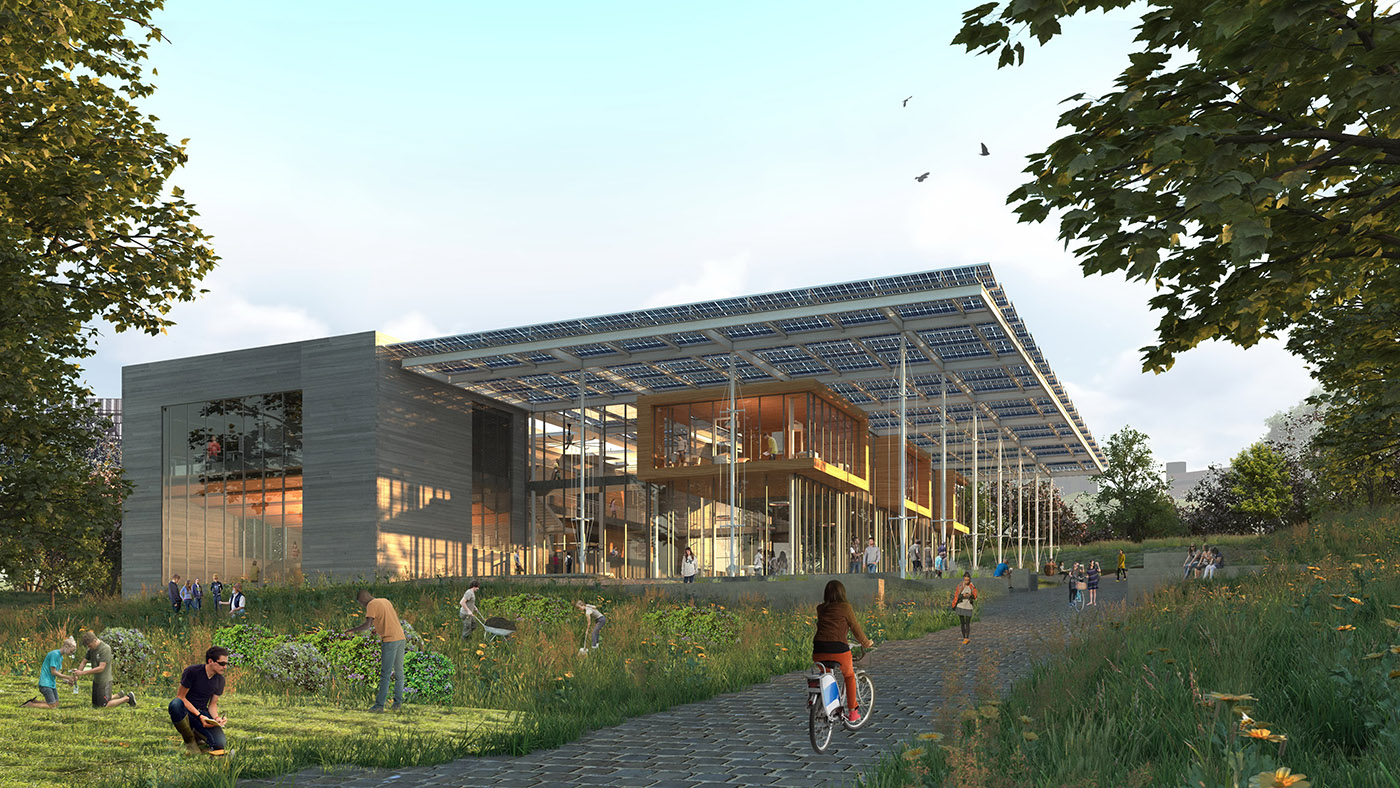 This conceptual image of the Georgia Tech building shows the roof structure with a PV array.