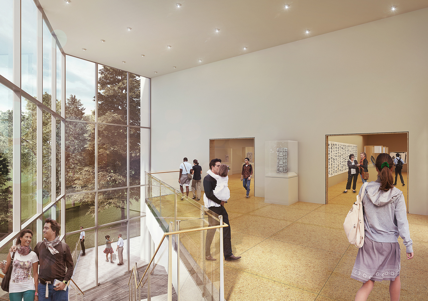 Renderings in the RFQ show new doorways at the rear of the central Garden Court, opening up to a two-story, glass-walled reception space with a wide stairway. Two gallery spaces would be on the main level of the expansion, and the education and event spaces would be on the ground level below.