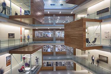 The space is organized in “petals” arrayed around a central atrium that visually and spatially connects activities, and maximizes daylight and views. Perkins+Will said this brings groups together and exposes research activities with transparent labs that can be viewed from the interior and exterior.