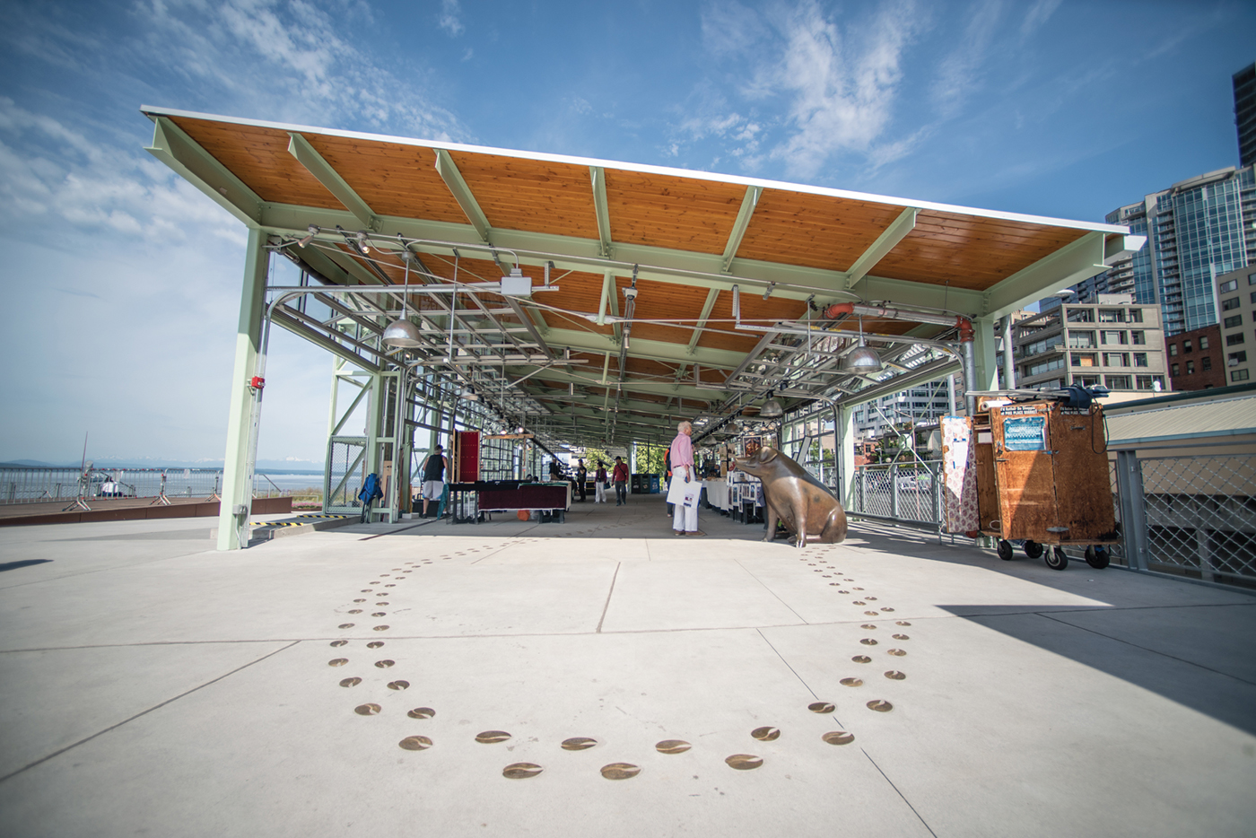 The MarketFront has three new public art installations Northwest Microcosm, Western Tapestry and Billie the Piggy Bank each designed by local artists.