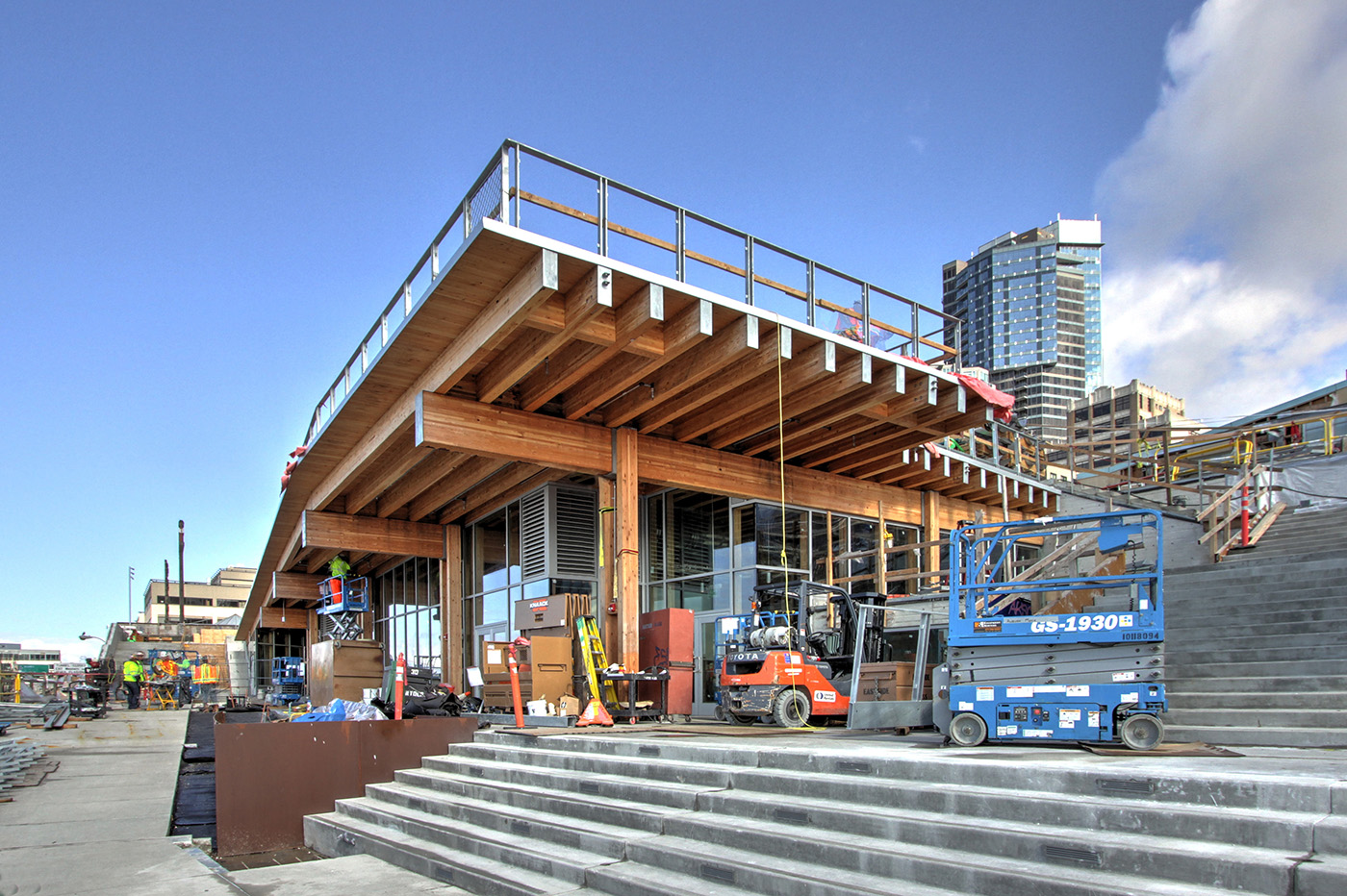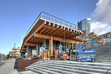 Steel framing was selected to minimize member sizes and maximize the transparency of the pavilion, using narrow tubes for support and rod bracing for seismic stability. Glass-clad operable walls form the east and west sides of this vendor space, allowing for comfort even during extreme weather days in Seattle.