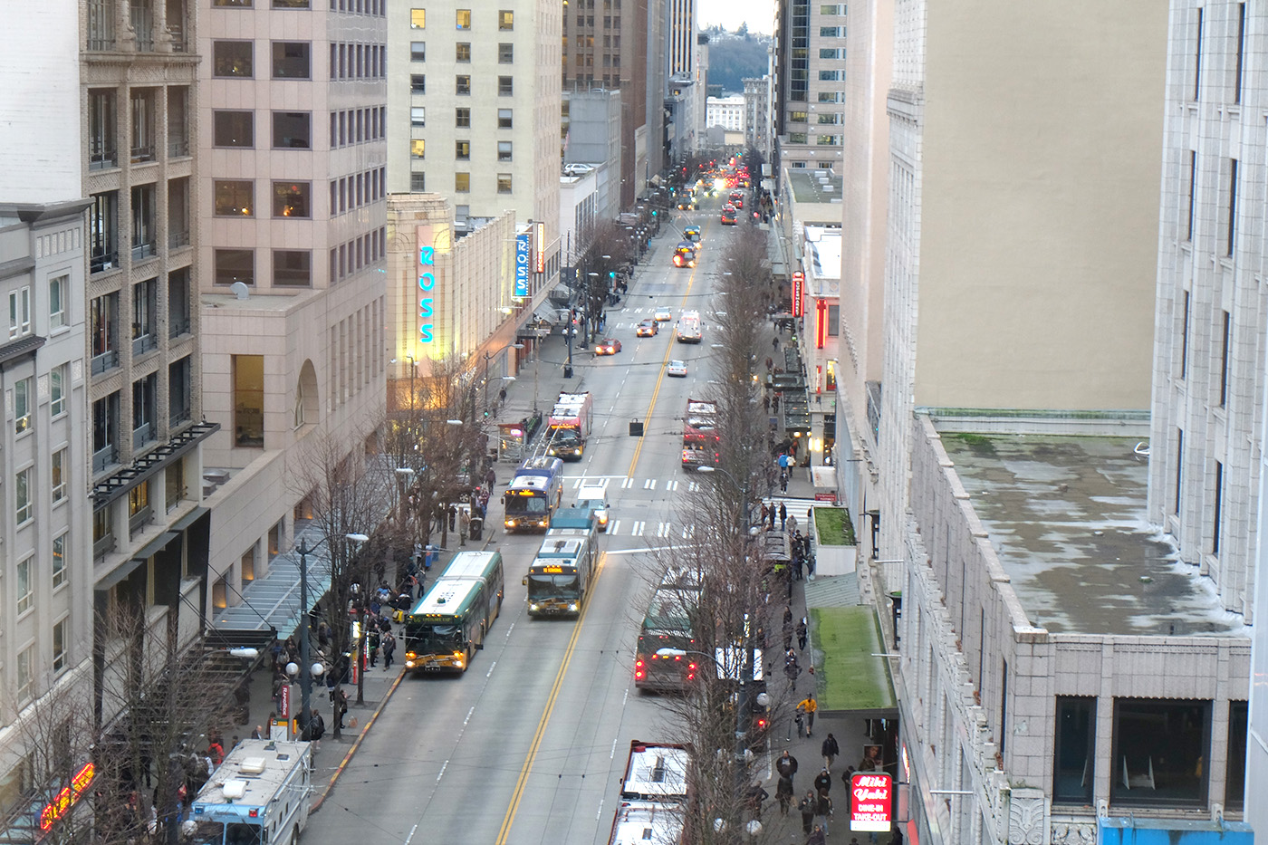 Third Avenue in downtown Seattle carries 52,000 transit riders every day, but few of those people stop long enough to enjoy a cup of coffee, shop or meet up with others, according to the Downtown Seattle Association.