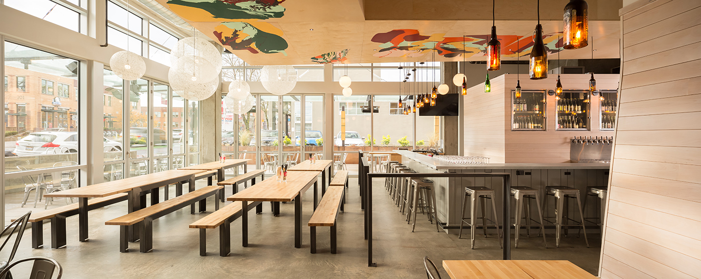 The team also includes Gauge Design (steel work on table legs, wood storage bins and barrier rails), Seattle Cabinets (butcher block tables and pizza bar), Nik Plastering Systems (plaster on pizza oven and accent wall), Gonchar Construction (cooler mill work), Smith and Greene (kitchen equipment), True Point Metal Works (zinc countertops), West Coast Electrical Services (electrical), American Expressions (stain and paint), IDS (audio-video), Maurer Sales (taps) and JK Corp USA (stainless steel).