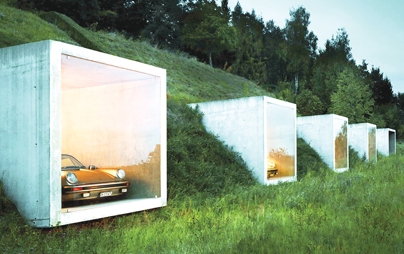 Two of the more interesting garages is Garagenatelier, an “exclusive” structure built into a Swiss mountainside. Eight glass-and-concrete cubes poke out of the slope, serving as art pieces as well as a place to leave your Aston Martin before setting off on your skis.