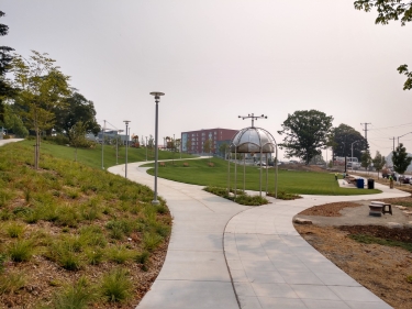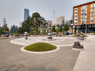 Seattle Parks and Recreation yesterday took down construction fencing at Yesler Terrace Park — revealing a new focal point for the rapidly evolving neighborhood.