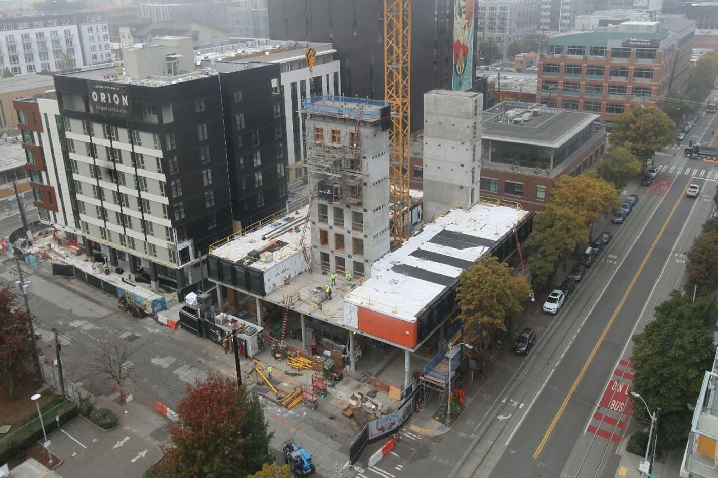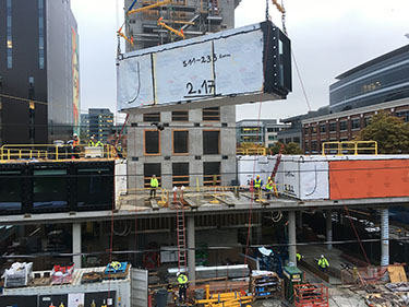 The 264-room hotel will be made from 228 modules that now are being stacked on a concrete podium.