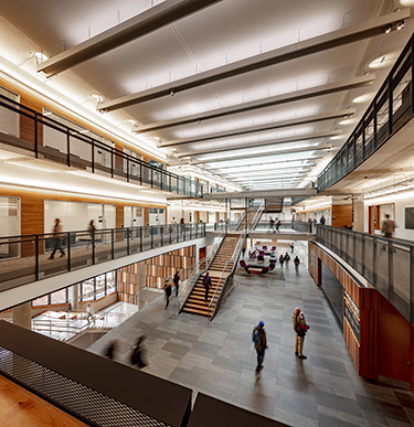 The $110 million project deliberately mixes classrooms, offices and workrooms to encourage students, researchers and faculty to talk and exchange ideas. In a press release, LMN said a central atrium is at its heart, providing visual and physical connections to all floors, and acting as the school's cultural hub.