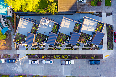 The townhouses were constructed to Built Green 4 Star standards. Sustainable features include passive solar heating, energy efficient heat pumps, low-VOC materials and bio-retention tanks.