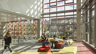 The project includes sustainable strategies. Building analysis modeling optimized daylight, solar exposure and natural ventilation. A multistory classroom bar with a north-south orientation maximizes solar heat gain in the winter, while sunshades limit solar heat gain in the summer. Indicator lights in every classroom empower students to help manage classroom operation modes.