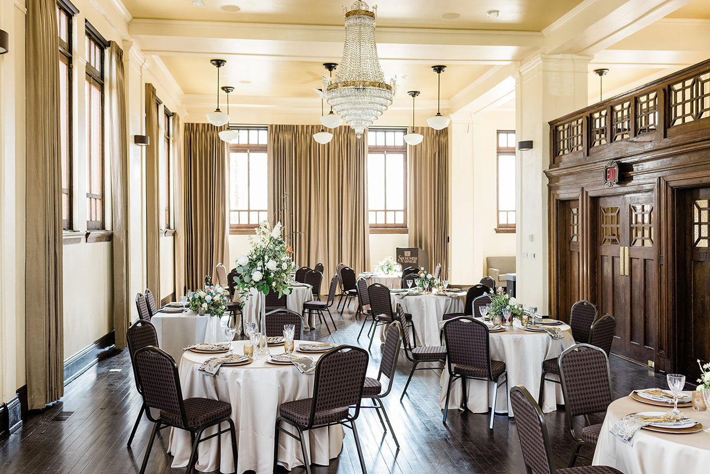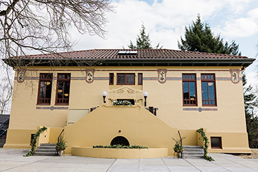 The former library building was designed by Bigger and Warner Architects and is an example of Prairie style architecture.