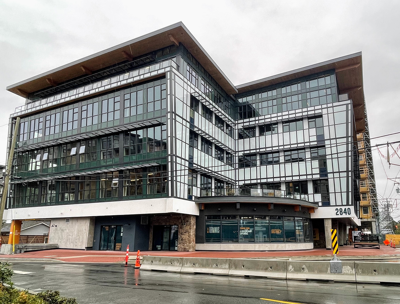 A retail and commercial office building recently completed at 2840 Peatt Road in Langford, B.C., reportedly is the first mass timber post-and-beam building to have buckling-restrained braces housed within a timber frame.
