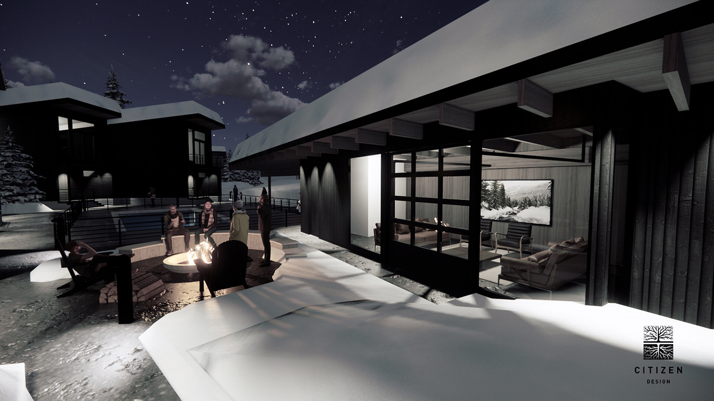 The two-story homes are being built in a circular formation bordering the pool and community room. Each home has two bedrooms and two bathrooms and is 1,250 square feet. The homes have a personal balcony, covered parking, and a storage locker for mountain and outside gear. The community has heated sidewalks and a shared firepit.