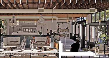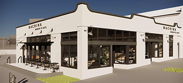 Construction began on the project this month, with Wilcox Construction as the general contractor. Macrina's new space was designed by Floisand Studio Architects and is described as a “bright, airy space that will be convenient for those on the go and comfortable for those wishing to linger.” Renderings show a light-filled interior with a mix of seating, white accents, and a distinctive wood-paneled ceiling. The main coffee bar and counter will be located on a raised area to one side of the cafe. The building's exterior also looks set to be repainted a crisp white.