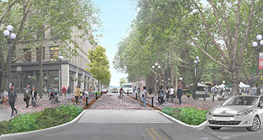 In a press release, the city said the project will connect the core of Pioneer Square to the new waterfront by making it easier to walk, roll and cycle between these areas. Design improvements include curbless streets to help calm traffic, wider sidewalks that accommodate cafes and other activations, and added greenery and native plants to improve the pedestrian experience.