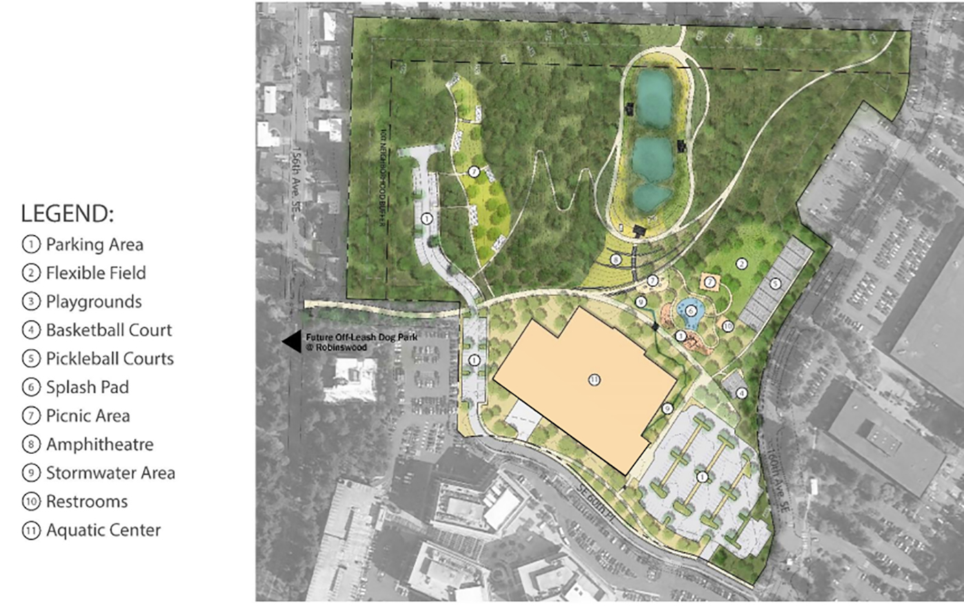 According to the city's website, environmental review is anticipated to take approximately a year to complete, at which time the council would be asked to officially adopt the updated master plan. The new master plan, which the city has designed in collaboration with an architecture and engineering team led by Walker | Macy, includes a parking area, flexible fields, a children's playground, basketball and pickleball courts, a splash pad, picnic area, amphitheater, public restrooms, and the aforementioned aquatics center. According to the city's website, the site is currently the only undeveloped city-owned parcel large enough to accommodate a new aquatics facility.