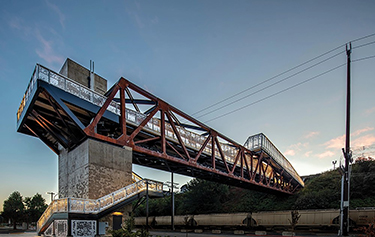 LMN describes the bridge design as pragmatic and economical. Its truss form responds directly to programmatic needs while also recalling the form and character of traditional railroad trusses found across the Pacific Northwest. Structural elements consist of weathering steel, a raw form of steel, which uses rust to form a protective layer, providing corrosion resistance and enhancing the bridge's long-term maintainability as well as giving it a distinctive color.
