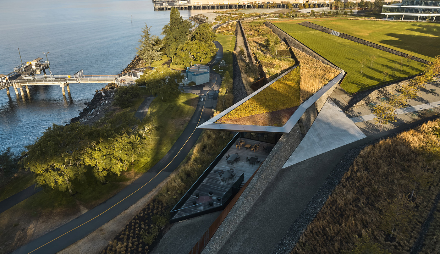 The building is designed to appear “hidden in plain sight” and is discretely integrated into the surrounding landscape. It has a green roof that mirrors the surrounding planted ground plane and is lifted at one end.