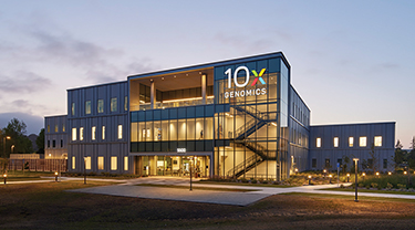 10x Genomics’ new lab and office building in Pleasanton, Calif., integrates research labs, cold storage, warehouse facilities and cleanroom space that enable in-house production of consumable biologic products. This is the first phase of a three-building “science village.” Emphasizing flexibility and scalability, the design accommodates the evolving requirements of modern biotechnology, and can adapt to 10x Genomics’ growth.