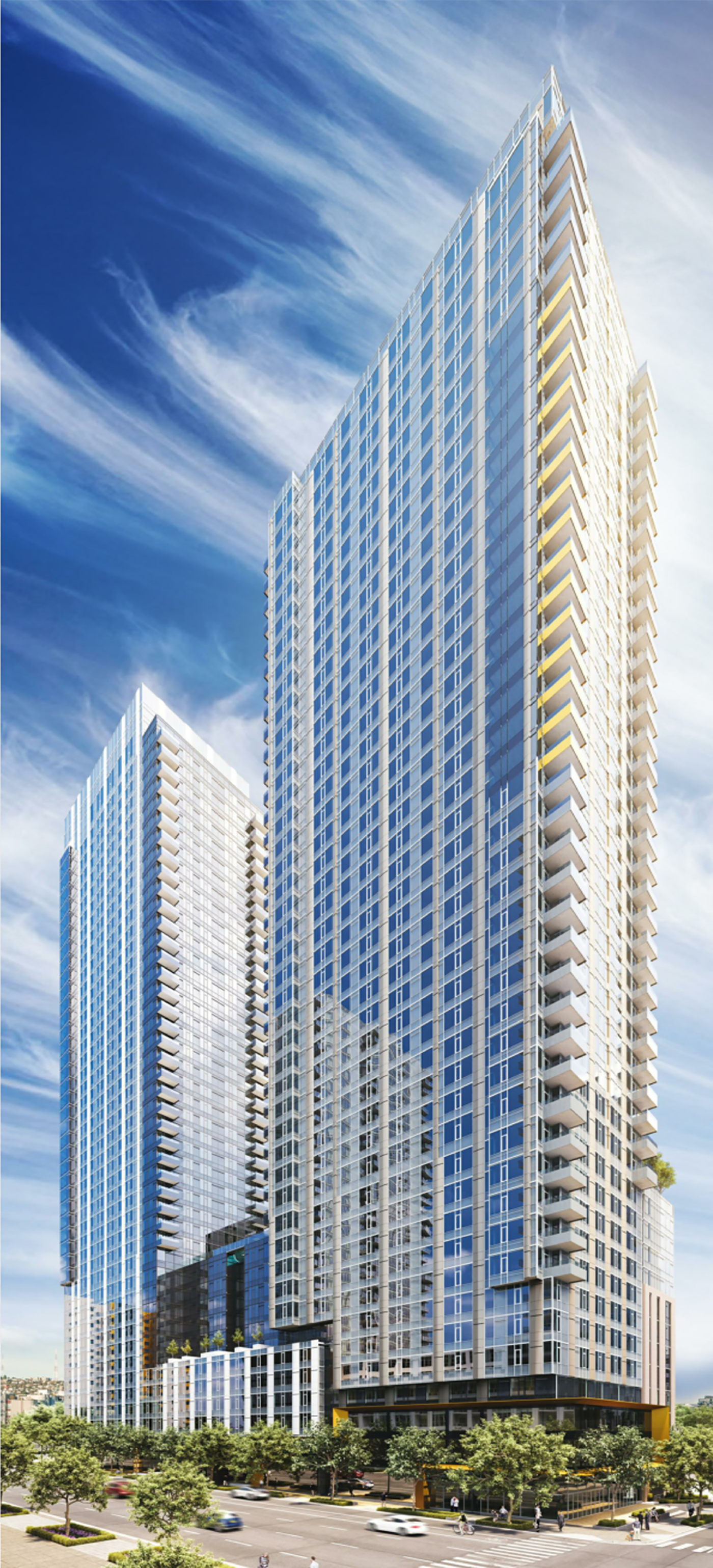 Beneath the residential towers will be a podium level with around 10,000 square feet of retail space. Beneath the podium will be an eight-level subterranean parking garage.