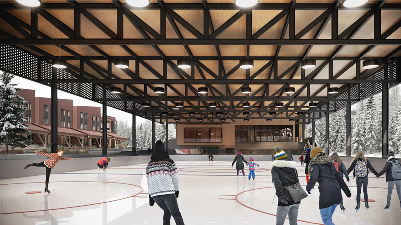 Moose Meadows comprises 125,000 square feet of new space including a 25,000-square-foot workforce housing building, retail amenities, a 20,000-square-foot community center, a daycare facility, and an NHL regulation-sized, outdoor, covered hockey rink.