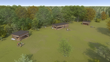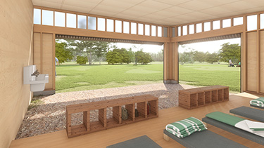 The basic module of the design is a pavilion-like structure with roll-up doors allowing it to become fully enclosed during bad weather and to prevent unauthorized use outside of school hours. It is sized so that when buttoned up, it exactly meets DCYF’s minimum area requirements for child care, allowing it to operate continuously through most weather events. Full climate control is not required; outdoor schools regularly operate at temperatures between 20 to 90 degrees. Closed doors moderate the extremes of temperature, and can be supplemented by low-capacity radiant heat panels or portable air conditioning units if necessary.