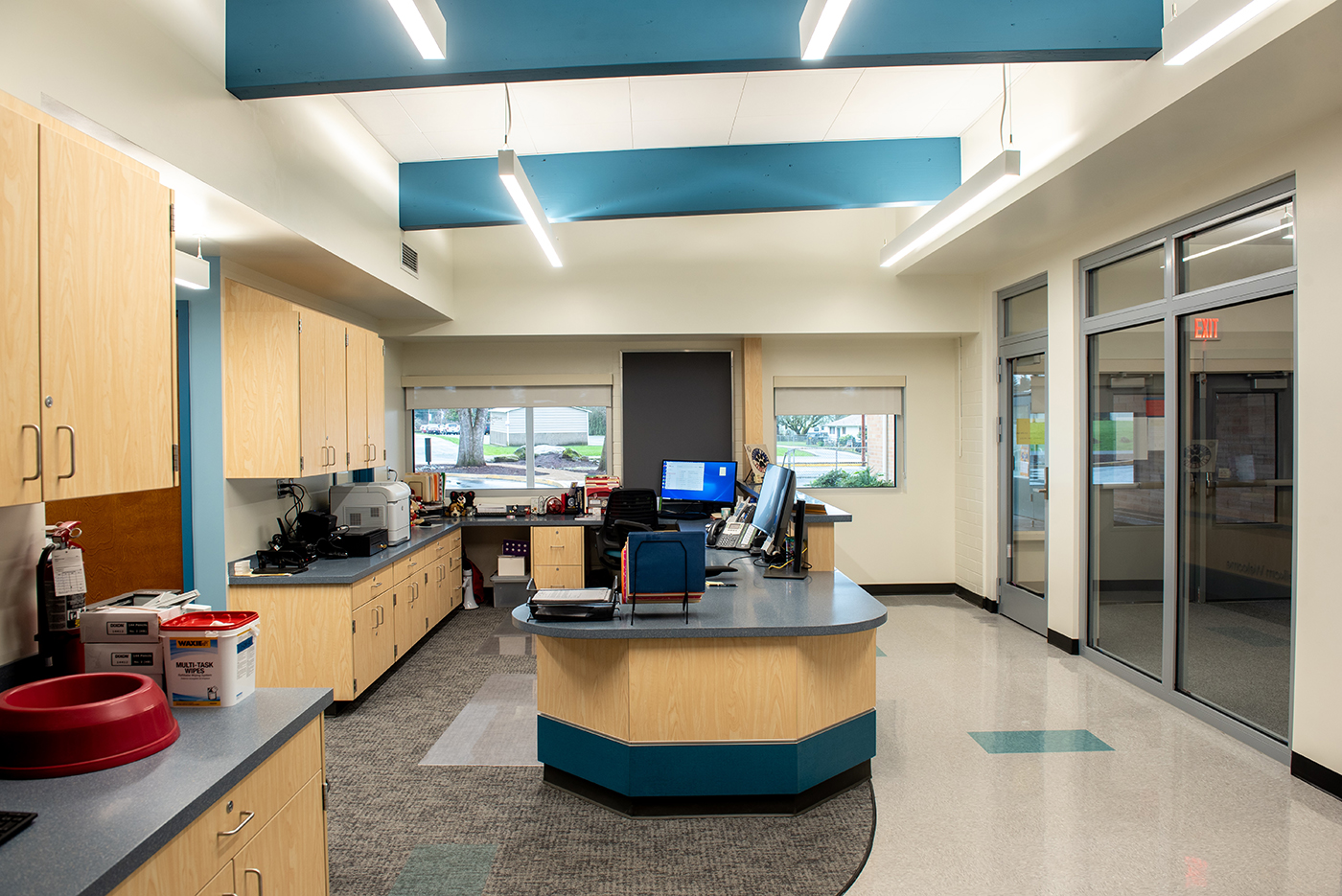 Relocated and reconfigured to improve monitoring efforts, the main office shares a wall with a secure entry vestibule. This wall and its door were specified with transparent, forced-entry rated glazing, which allows staff to visually assess visitors and control access.