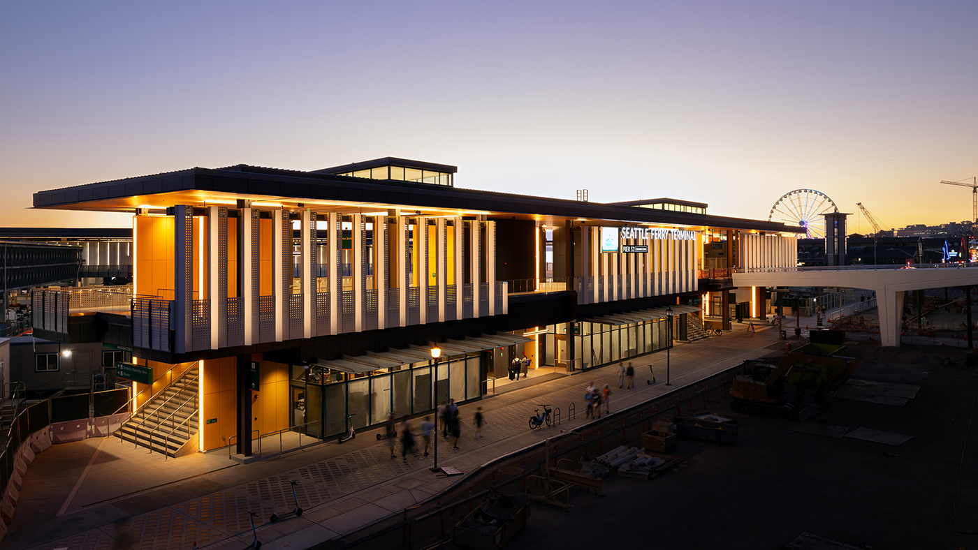 The Seattle Ferry Terminal debuted in 2023 and replaced the decades-old Colman Dock at the Seattle waterfront. It was the first public building to be constructed west of Alaskan Way on the waterfront following the removal of the Alaskan Way Viaduct.