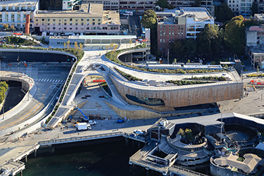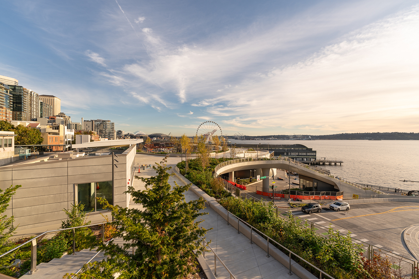 The elevated park is designed to be accessible and has two elevator connections — one at the Pike Place Market garage on the east, and one at the Seattle Aquarium's Ocean Pavilion on the west.