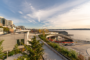 The elevated Overlook Walk straddles a nearly 100-vertical-foot gap between the 97-year-old Pike Place Market and the new 20-acre waterfront below. The pedestrian connection offers panoramic views of downtown, Elliott Bay, the Olympic Mountains and, when it's cooperating, Mount Rainier, as it winds past a playground, a concessions area and canopy, a public park on the roof of Seattle Aquarium’s newly opened Ocean Pavilion on its way to the promenade.