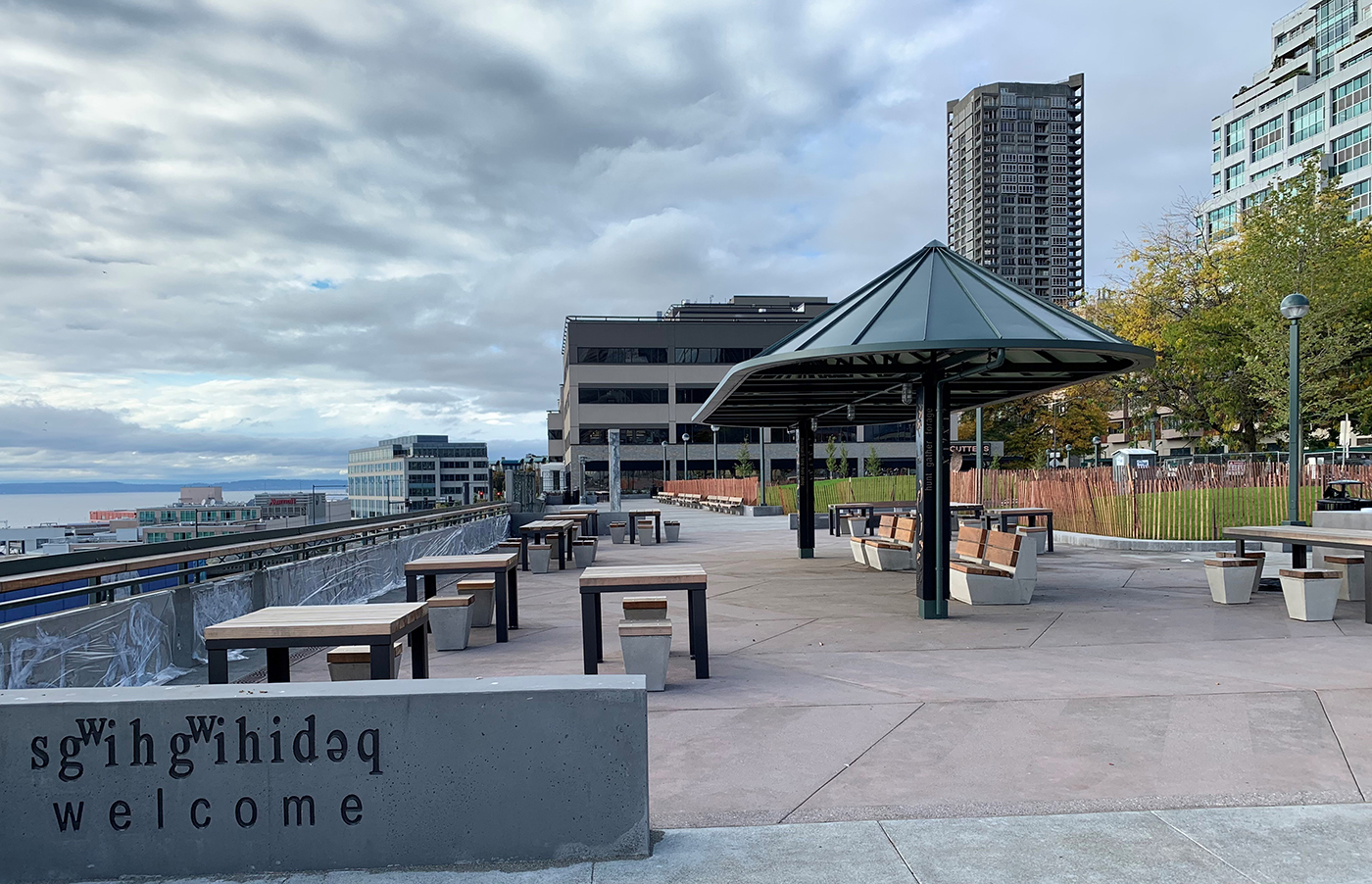 The extensive upgrade of the 0.8-acre park covered the renovation of an existing seating area; the renovation of a former children's play area; the upgrade of landscaping and new landscaped elements; installation of a replacement pavilion with fewer columns to help open up views to Elliott Bay; the relocation of a concrete panel with the handprints and signatures of original park designers Victor Steinbrueck and Richard Haag; and the installation of the Coast Salish design elements. Those include column wraps on the new pavilion, Indigenous welcome text at entrance walls, and a concrete path with a basket-weave pattern.