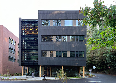 The cutting-edge building is located east of the WWU Communications Facility and is connected to that property by a sky bridge to maximize program efficiencies and increase collaboration opportunities. Perkins&Will designed Kaiser Borsari Hall. It was built by Mortenson.