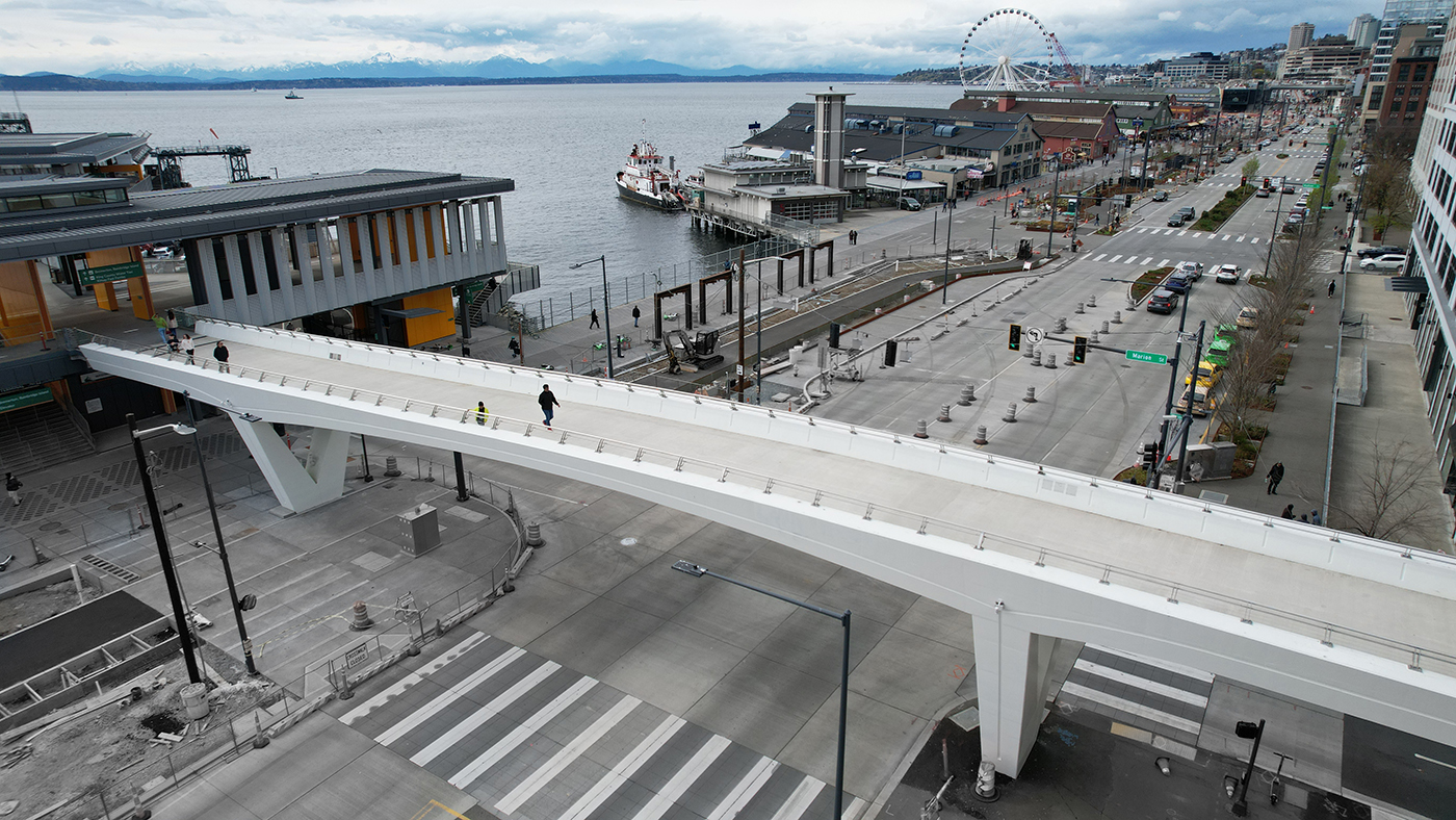 The new structure replaces half the original bridge between the Colman Dock Ferry Terminal and First Avenue. The remaining original bridge will be replaced when additional funding is available. The project included repaving Marion Street between Alaskan Way and Western Avenue, bridge trench drains, and rail and aesthetic lighting.
