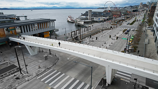 This new design creates safe, accessible access to Colman Dock, the waterfront and downtown, becoming an icon on the revitalized waterfront. The Marion Street Pedestrian Bridge Replacement removed the existing span attached to the Commuter Building, demolished the temporary bridge that wrapped around Columbia Street and Western Avenue, and constructed a new bridge on the original alignment.