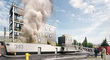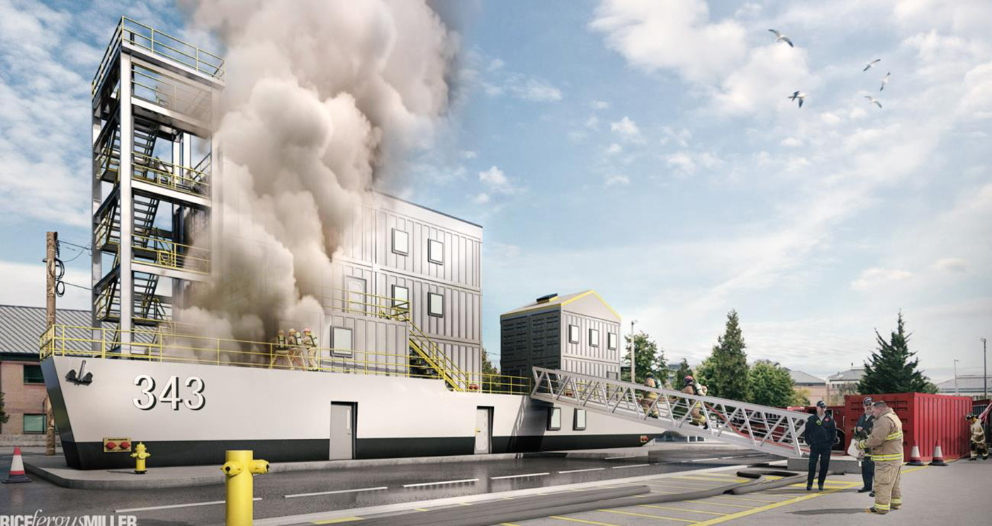 The training center will be the only marine firefighting facility in the state accessible to municipal firefighters, and the design includes simulations of a naval pier, an actual U.S. Navy damage control locker, and a naval brow — a gangway connecting vessels to land.