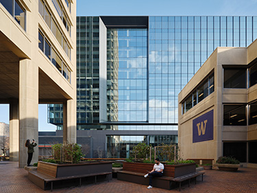 A defining architectural feature is the aperture on the west facade, a recessed opening that breaks up the building’s massing, introduces a striking visual identity, and frames views to the plaza at UW Tower to create an urban micro-campus. This design move balances aesthetic refinement with functional benefits, creating visual interest while enhancing the building’s connection to its surroundings.